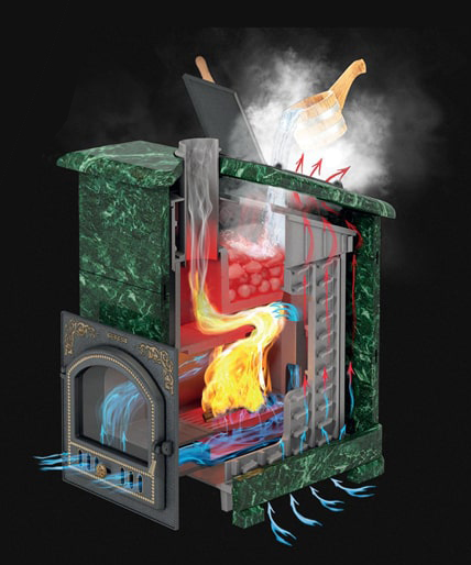 Here, the air stream mixes with fire, causing active combustion of pyrolysis gases and a sharp increase in temperature, which allows heating a massive heater with cast iron inserts and rocks in less than 1 hour to temperatures above 600 ° C. In the Gefest furnaces, the heater is located inside the furnace, heated by direct fire from all sides and is the main steam generator. The huge heat reserve in such a stove makes the stove “non-fillable”, which makes it possible to obtain high-quality finely dispersed and light steam in volum that are many times higher than the standard norms for steam rooms.